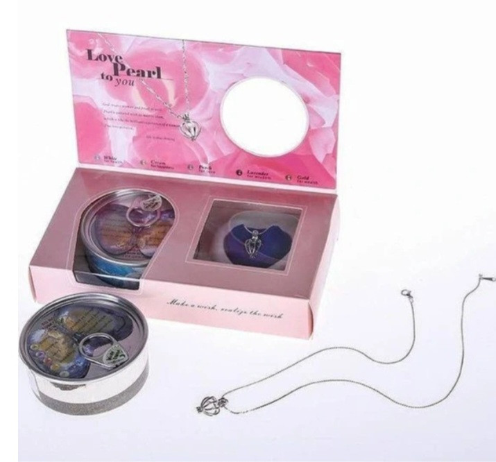 صدف که داخلش مروارید قرار دا رد که باز کرده مروارید را داخل گردنبند مخصوص قرار داده