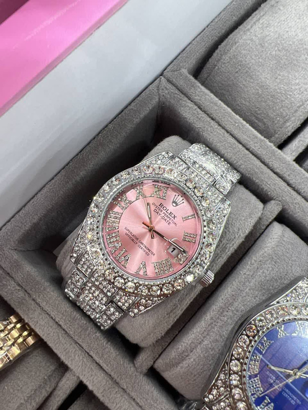 ساعت مچی فول نگین رولکس اصلی رنگ ثابت نگین های مخراجکاری شده ضد آب ضد حساسیت ضد خش، دارای تقویم، بسیار زیبا و شیک ساعت اصلی با آرم رولکس
