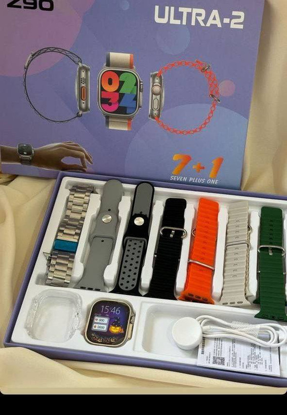ساعت هوشمند الترا ۲ با قابلیت وصل شدن به گوشی جهت مکالمه نمایش پیامک وکلی برنامه های کاربردی دیگر دارای هفت بند، کاور ساعت، سیم شارژر وایرلس